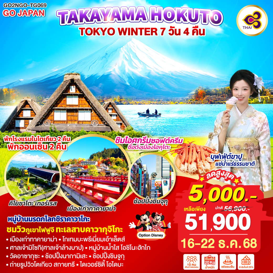 | 2 | นาโกย่า (สนามบินชูบุเซ็นแทร์) - หมู่บ้านชิราคาวาโกะ - เมืองทาคายาม่า – เมืองเก่าทาคายาม่า – สะพานนากะบาชิ - ผ่านชมทาคายาม่า จินยะ - แช่น้ำแร่ธรรมชาติ | ✘ | ✔ | ✔ | TAKAYAMA ONSEN HOTEL หรือเทียบเท่าระดับ 3 ดาว [♨] |