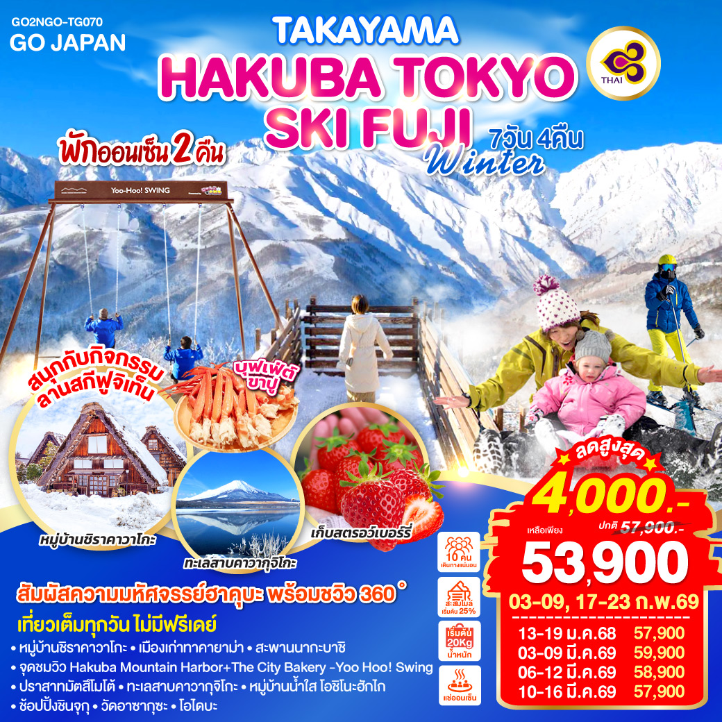 | 2 | นาโกย่า (สนามบินชูบุเซ็นแทร์) - หมู่บ้านชิราคาวาโกะ - เมืองทาคายาม่า – เมืองเก่าทาคายาม่า – สะพานนากะบาชิ - ผ่านชมทาคายาม่า จินยะ - แช่น้ำแร่ธรรมชาติ | ✘ | ✔ | ✔ | TAKAYAMA ONSEN HOTELหรือเทียบเท่าระดับ 3 ดาว ♨️ |