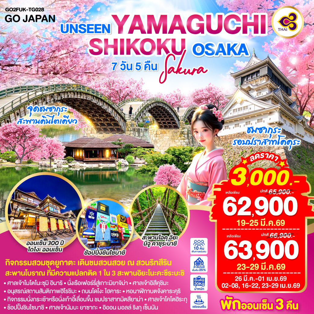 | 2 | คิวชู (สนามบินฟุกุโอกะ) – ปราสาทโคคุระ – ศาลเจ้าโมโตโนะซุมิ อินาริ – แช่น้ำแร่ธรรมชาติ | ✘ | ✔ | ✔ | HAGI ONSEN AREA หรือเทียบเท่าในระดับ 3 ดาว |
