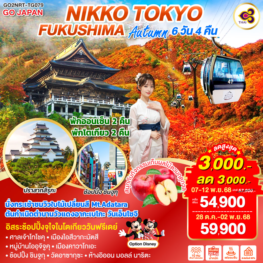 | 2 | โตเกียว (สนามบินนาริตะ) – เมืองนิกโก้ – ศาลเจ้าโทโชคุ – เมืองไอสึวากะมัตสึ – หมู่บ้านโออุจิจูคุ – แช่น้ำแร่ธรรมชาติ | ✘ | ✔ | ✔ | FUKUSHIMA HOTEL AREA หรือเทียบเท่าในระดับ 3 ดาว |